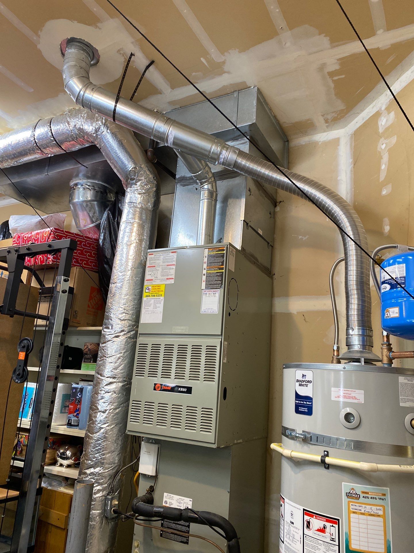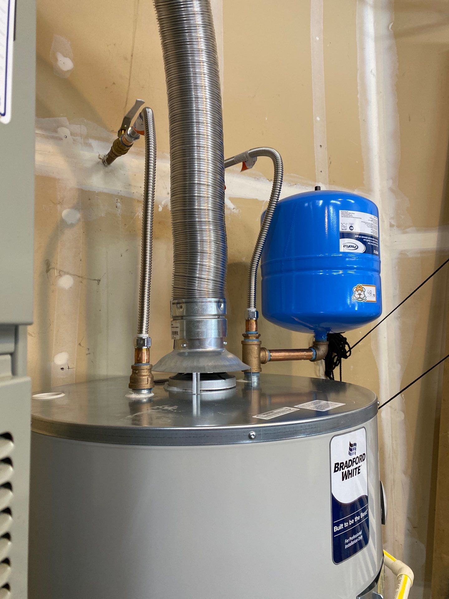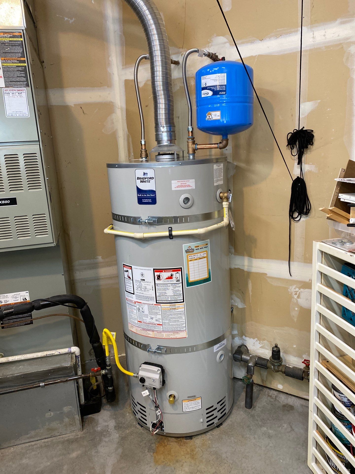 Replaced a leaking 50 gallon gas water heater in a residential garage with a new Bradford White 75 gallon high input gas water heater. This included reconfiguring the venting from 3" to 4".